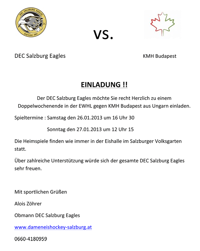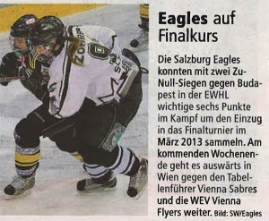 Fünf Runden vor Schluss des Grunddurchganges in der EWHL ist es Gewissheit das sich die Eagles für das Final four am 2.+ 3.März 2013 in Amstetten qualifiziert haben. Am vergangenen Wochenende gastierte Budapest zu zwei Spielen in der Mozartstadt. Drei Punkte mussten eingefahren werden um sich endgültig zu qualifizieren.Trotz einiger Krankheits und Verletzungsbedingter Ausfälle war man sich der schweren Aufgabe bewusst und jede Spielerin wollte schon im ersten Spiel alles klar machen.Ein hart umkämpftes 1:0 am ersten Tag brachten aber die nötigen drei Punkte und somit konnte man am Sonntag beruhigt in die zweite Begegnung gehen die dann doch klar mit 5:1 gewonnen wurde.In den letzten fünf Spielen im Grunddurchgang geht es jetzt nur mehr um die Platzierungen die dann für die Halbfinalpaarungen beim Final four entscheidend sind.Am Sonntag den 3.Februar gastiert der momentane Tabellenführer Vienna Sabres noch einmal in der Mozartstadt bevor es am 16.+17. Februar nach Minsk (Weissrussland) zu den beiden Auswärtsspielen geht.Den Schlusspunkt im Grunddurchgang setzen dann zwei Heimspiele am 23.+24.Februar gegen Bozen. Ein Ziel das erreichen der Final four konnte somit erreicht werden und bis zum Finalturnier sollten wieder alle Spielerinnen fit sein. Wenn wir komplett sind und alle wieder fit sind ist in Amstetten alles möglich. Das nächste Ziel ist natürlich das erreichen des Staatsmeisterschaftsfinales wo die Spiele nach dem EWHL Finale beginnen werden.