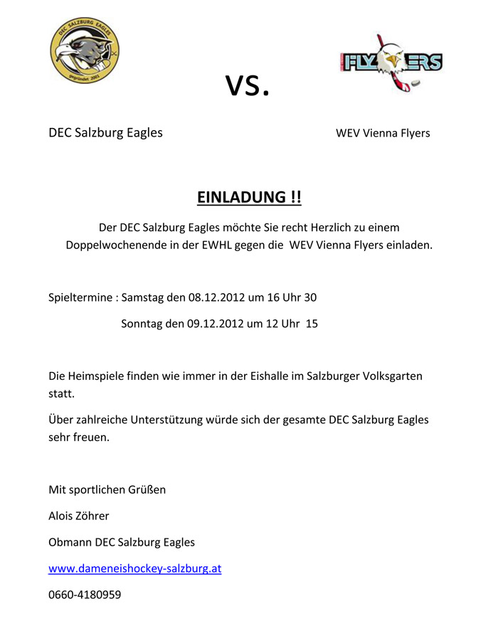 Um einen weiteren wichtigen Schritt Richtung EWHL Finalturnier zu machen war klar das gegen einen direkten Gegner wie die WEV Vienna Flyers die Heimspiele gewonnen werden müssen. Obwohl die Auswärtsspiele beide gewonnen wurden durfte man die Damen aus Wien nie unterschätzen. Gut eingestellt von unseren Trainer Frank Seewald hatte man aber schlussendlich beide Spiele im Griff. Besiegte man die Wienerinnen am Samstag noch mit 7:1 (3:0,2:1,2:0) so konnte man die Sonntagspartie auch mit 5:1(1:0,3:0,1:1) gewinnen.Mit diesen beiden Siegen kletterte man vorläufig von Platz vier auf Platz zwei hoch. Vor der Weihnachtspause müssen die Eagles noch am 22.12.2012 zu einem Auswärtsspiel nach Bozen bevor es dann im Jahr 2013 mit der zweiten Hälfte weitergeht.